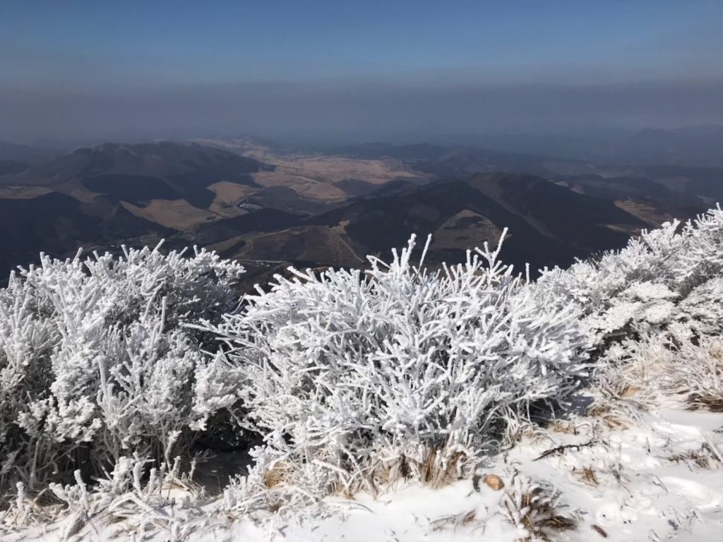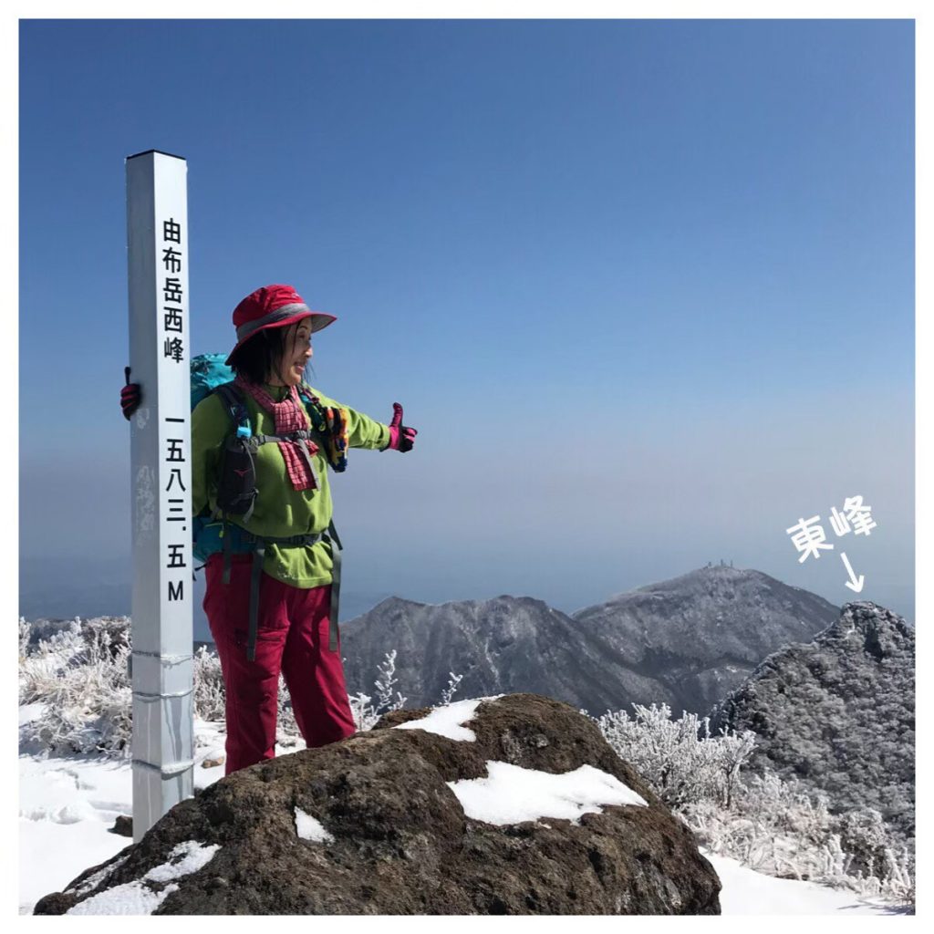 3月7日天気不安定の為に夜中に雪が降ってきたので翌日の朝、由布岳の山頂が雪が積もってた。念のためチェーンスパイクを持ってたが大丈夫だった。